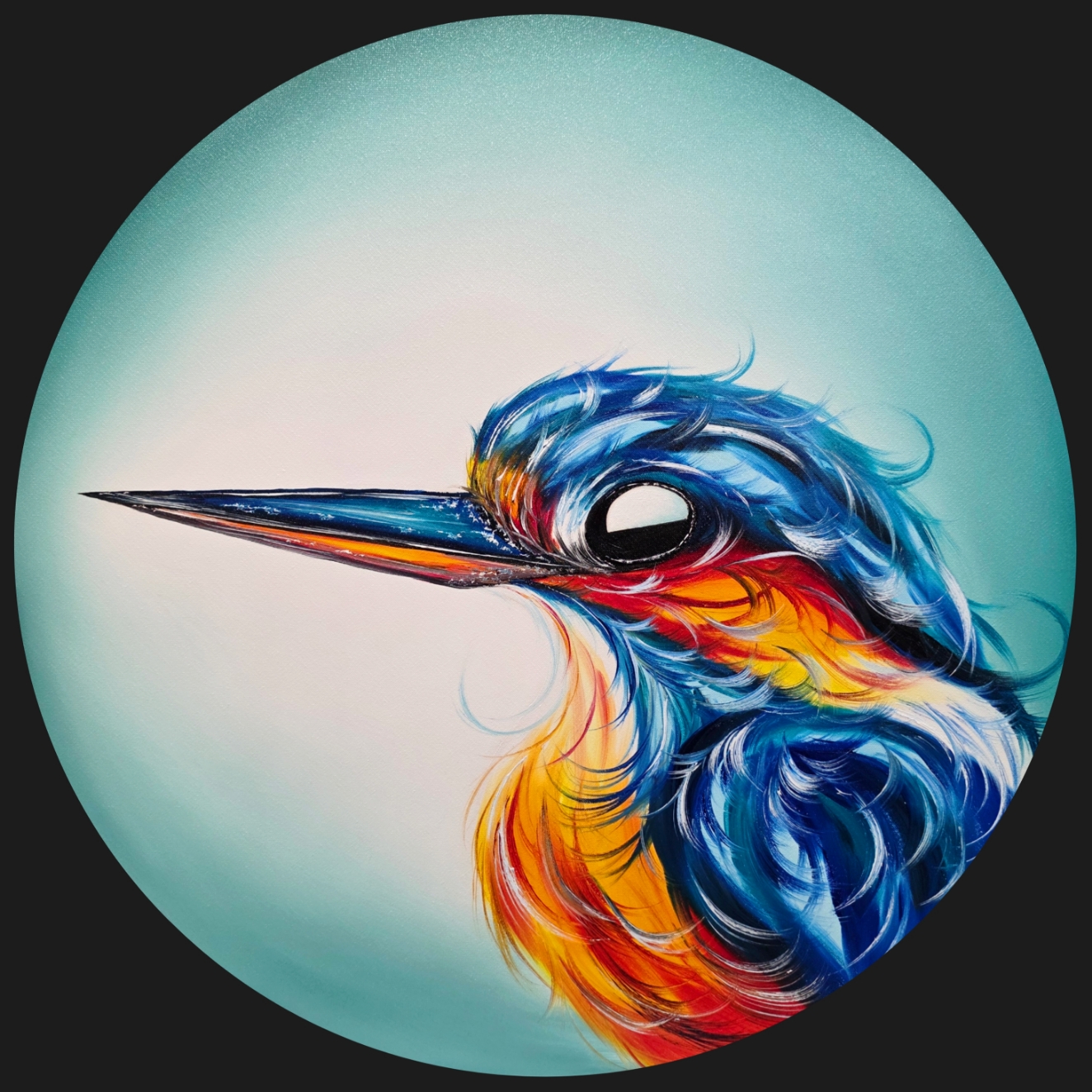 “Wim’ olieverf op katoen (60cm rond ) zonder witte rand.”